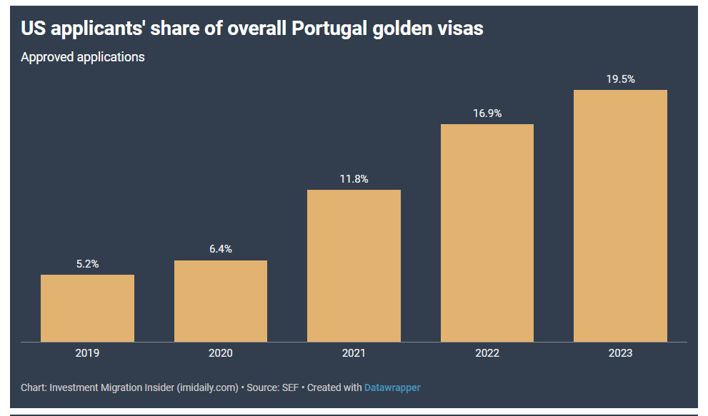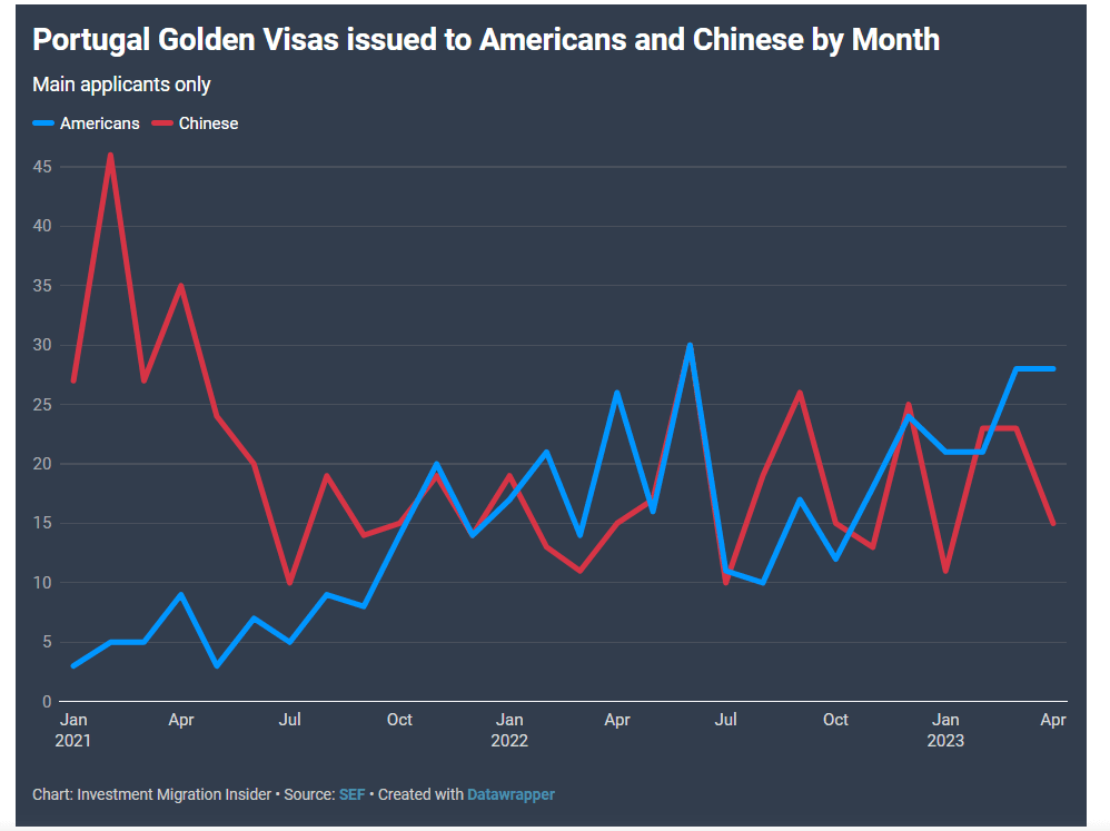 Điều đó có thể tương tự như nhóm Nhà Đầu Tư Mỹ. Năm 2020, người Mỹ bắt đầu quan tâm và tham gia vào chương trình Golden Visa Bồ Đào Nha. Đến năm 2022, người Mỹ đã vượt qua Trung Quốc, trở thành nhóm Nhà Đầu Tư tham gia chương trình Golden Visa Bồ Đào Nha hàng đầu. Trong khi đó, kể từ khi chương trình ra đời, Trung Quốc luôn là quốc gia dẫn đầu số lượng Nhà Đầu Tư nhận được thị thực vàng Bồ Đào Nha. Trong 5 tháng đầu năm 2023, các Nhà Đầu Tư Mỹ đã chiếm khoảng 1/5 phê duyệt, vượt xa Nhà Đầu Tư Trung Quốc, đang chiếm 14.3% lượt phê duyệt.
