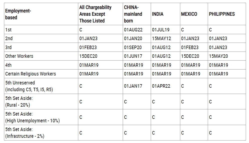 Bộ Ngoại Giao Hoa Kỳ vừa công bố bản tin Visa Bulletin tháng 10/2023. Theo đó, ở cả bảng A – ngày hành động cuối cùng và bảng B – ngày thụ lý đơn đều được đánh dấu C – nghĩa là “hiện tại/có sẵn” ở tất cả diện đầu tư EB-5 và cho danh mục “All Chargeability Areas Except Those Listed” (Các quốc gia trên thế giới).