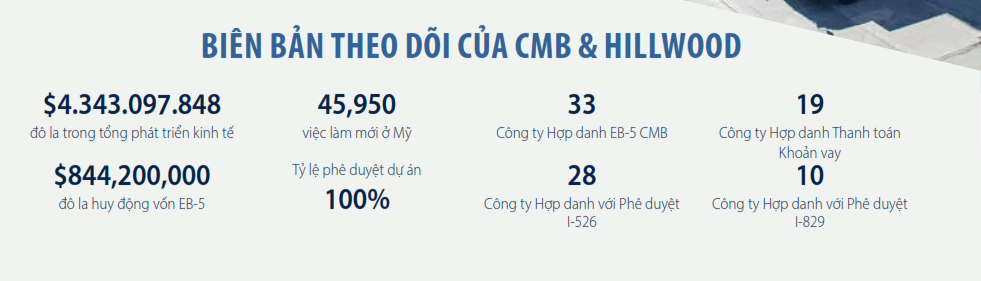 Kể từ năm 2012, CMB hợp tác với Hillwood để xác định và cấu trúc hàng loạt các công ty hợp danh EB-5 tốt nhất hiện có trên thị trường. Các công ty hợp danh đó tiếp tục duy trì tỷ lệ phê duyệt 100% ở cả hai giai đoạn I-526 và I-829. Rất ít trung tâm vùng có thể chứng minh được sự thành công của họ cho các nhà đầu tư ở tất cả các giai đoạn bao gồm phê duyệt I-829 và hoàn vốn.