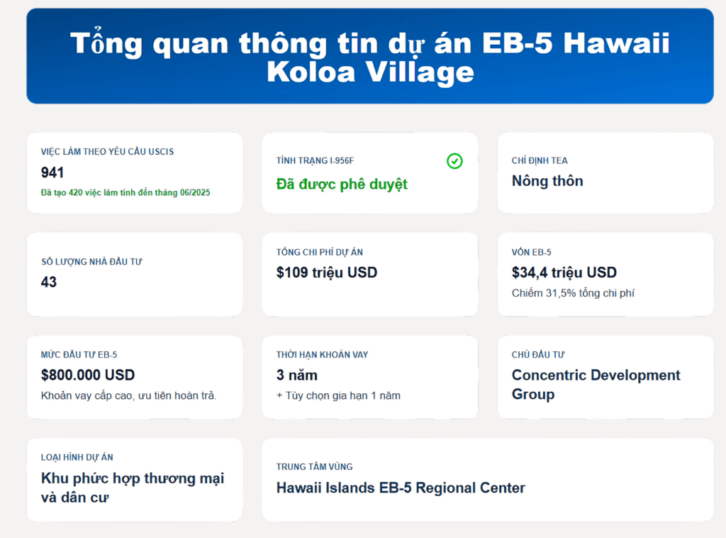 Tính đến tháng 07/2025, dự án EB-5 Hawaii Koloa Village đang tiến triển rất tốt, với việc xây dựng đúng tiến độ, doanh số bán hàng vượt trội và các yếu tố rủi ro chính của chương trình EB-5 đã được giảm thiểu đáng kể.