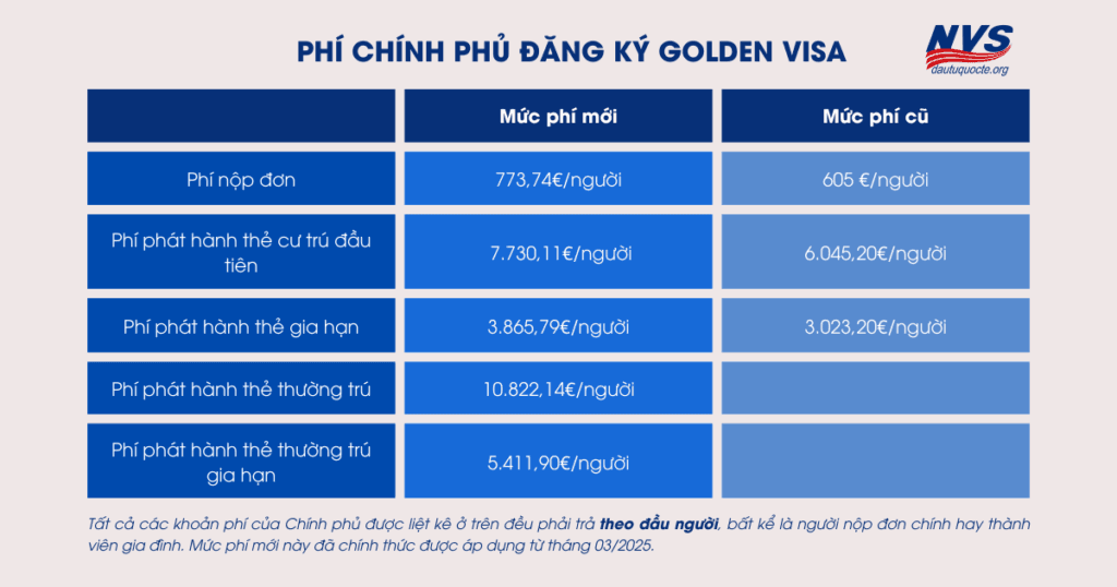 Theo Sắc lệnh số 307/2023 do Chủ tịch Hội đồng Bộ trưởng, Hành chính nội bộ và Tư pháp Bồ Đào Nha ban hành, các loại phí chính phủ liên quan đến chương trình Golden Visa cũng đã được điều chỉnh theo bảng phí mới như sau: