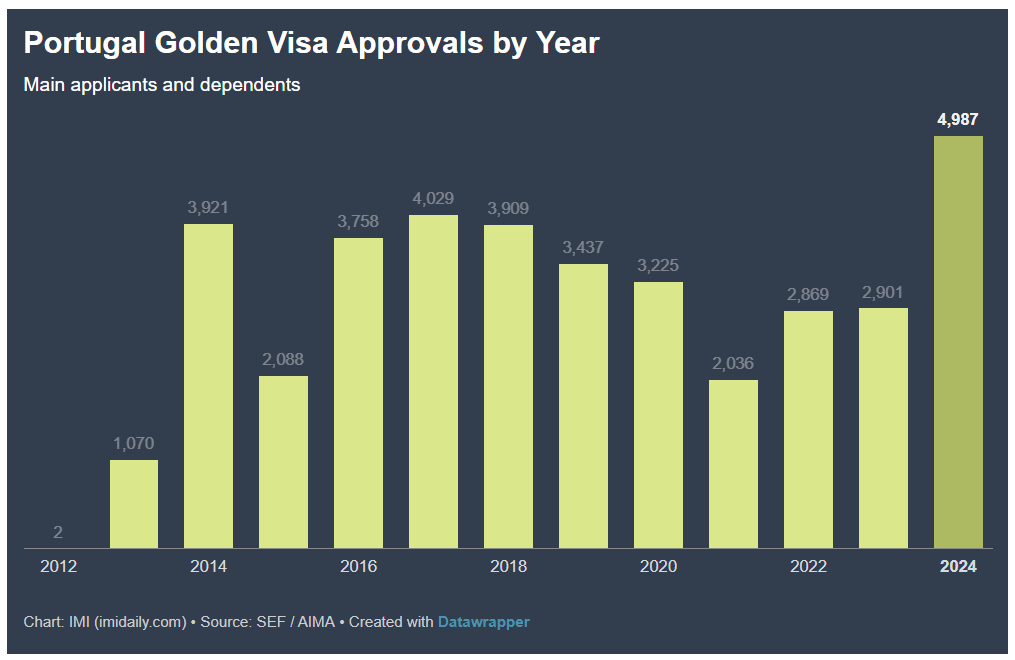 Trong năm 2024, Bồ Đào Nha đã cấp 4.987 “Thị thực Vàng” (Golden Visa) cho các nhà đầu tư và gia đình của họ. Đây là con số cao nhất từ trước đến nay, tăng 72% so với năm trước và vượt qua kỷ lục cũ của năm 2017.