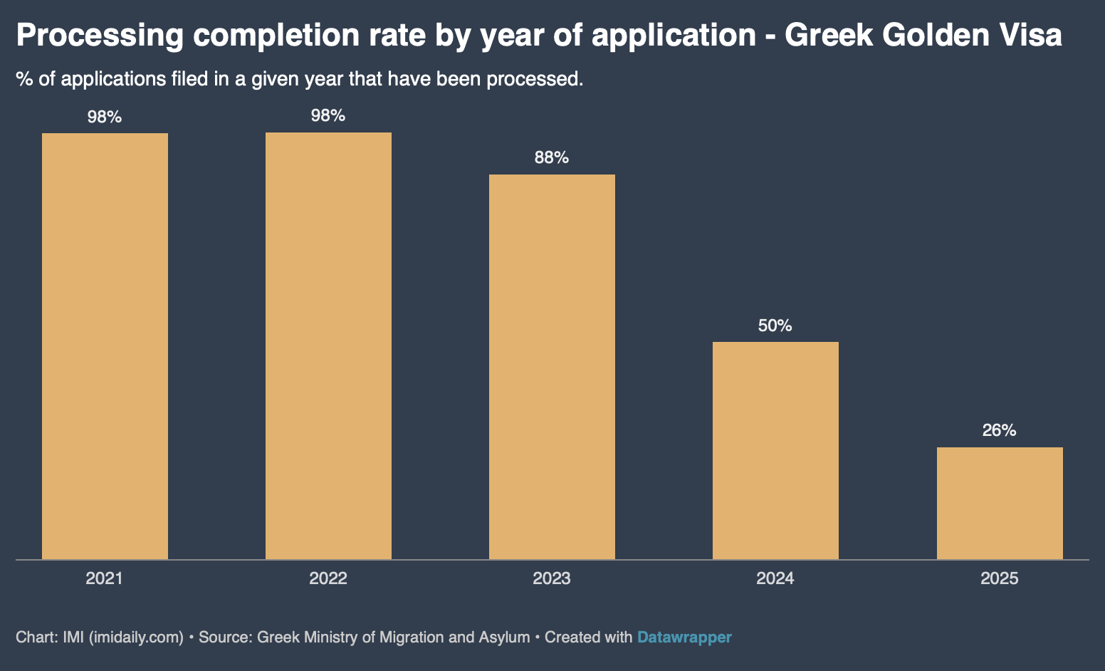 Năm 2025, Hy Lạp tiếp nhận trung bình 600 hồ sơ mỗi tháng. Với tốc độ này, dự kiến tổng lượng hồ sơ cả năm sẽ đạt khoảng 7.200 bộ, con số cao thứ ba trong lịch sử chương trình, dù thấp hơn mức trung bình 782 hồ sơ mỗi tháng của năm 2024.