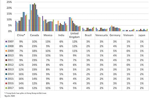 Đó là thống kê từ hiệp hội Quốc gia Chuyên viên địa ốc Mỹ (NAR). Báo cáo từ tháng 4/2016 đến tháng 3/2017 cho thấy người nước ngoài đã chi 153 tỷ USD để mua 284.455 bất động sản tại Mỹ. Người Việt Nam chiếm 2% trong số này. Tương đương với số tiền là 3,06 tỷ USD. Một thông tin nổi bật khác đó là số tiền để mua BĐS Mỹ từ người nước ngoài đã tăng 49% so với trước. Con số này tiếp tục có chiều hướng gia tăng trong cuối năm 2017.