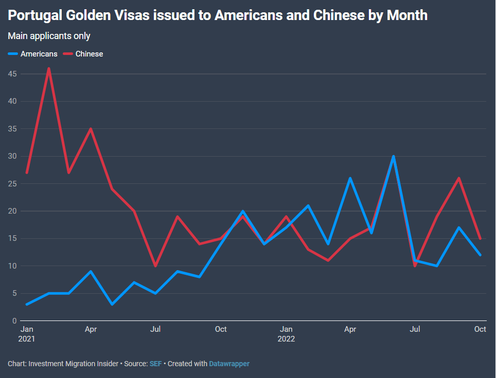 Tuy nhiên, những tháng gần đây cho thấy hai quốc gia này đang có lượng Nhà Đầu Tư tham gia là tương đương nhau. Từ đầu năm đến nay, đã có tổng cộng 174 người Mỹ và 175 người Trung Quốc nhận được Thị Thực Vàng Bồ Đào Nha. Trong những tháng gần đây thì người Trung Quốc bắt đầu có xu hướng tăng mạnh trở lại, trở thành nhóm người tham gia chương trình nhiều nhất như họ đã làm trong suốt nhiều năm qua.