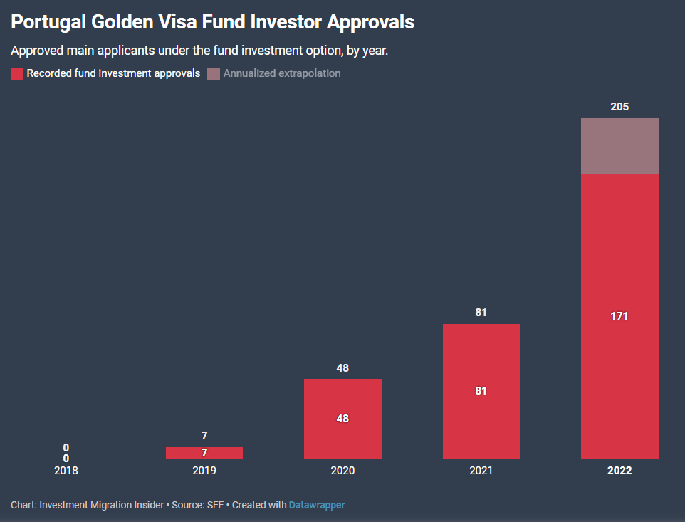 Từ đầu năm đến nay, Sở Di Trú Bồ Đào Nha (SEF) đã phê duyệt tổng cộng 1.009 đơn yêu cầu tham gia chương trình Golden Visa. Dự kiến khi kết thúc năm 2022, Sở Di Trú Bồ Đào Nha sẽ cấp Thị Thực Vàng cho 1.200 Nhà Đầu Tư. So với năm 2021, con số này tăng hơn 40%.