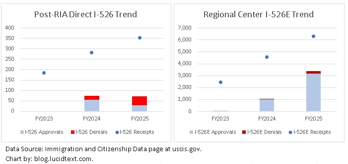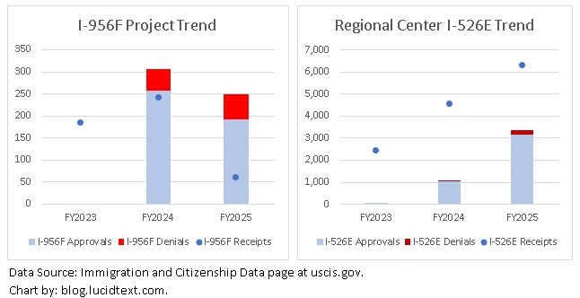 Đơn I-526E Trung tâm vùng giữ tỷ lệ phê duyệt cao dù lượng nộp mới vẫn áp đảo tốc độ xử lý. Đơn I-956F (dự án) được giải quyết nhanh, nhưng cần lưu ý rủi ro khi tỷ lệ từ chối dự án đang tăng nhẹ