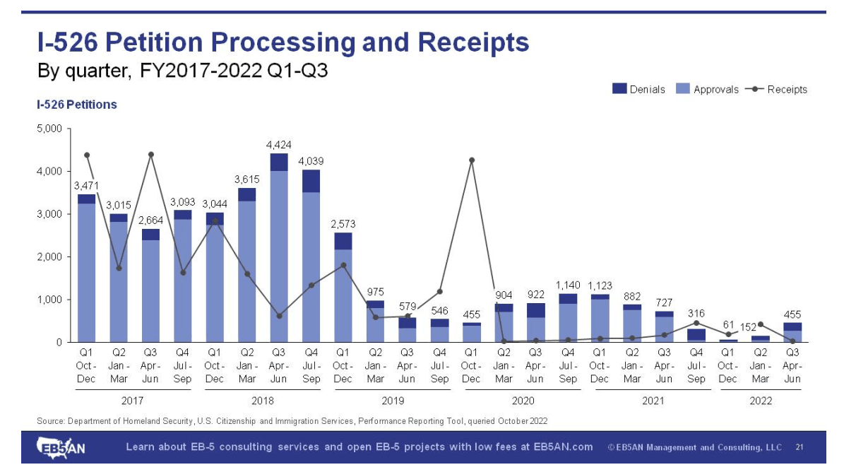 Kể từ quý II năm tài chính 2020 đến quý III năm tài chính 2022, số lượng đơn I-526 nộp vào USCIS được ghi nhận là thấp nhất kể từ khi chương trình EB-5 hoạt động.