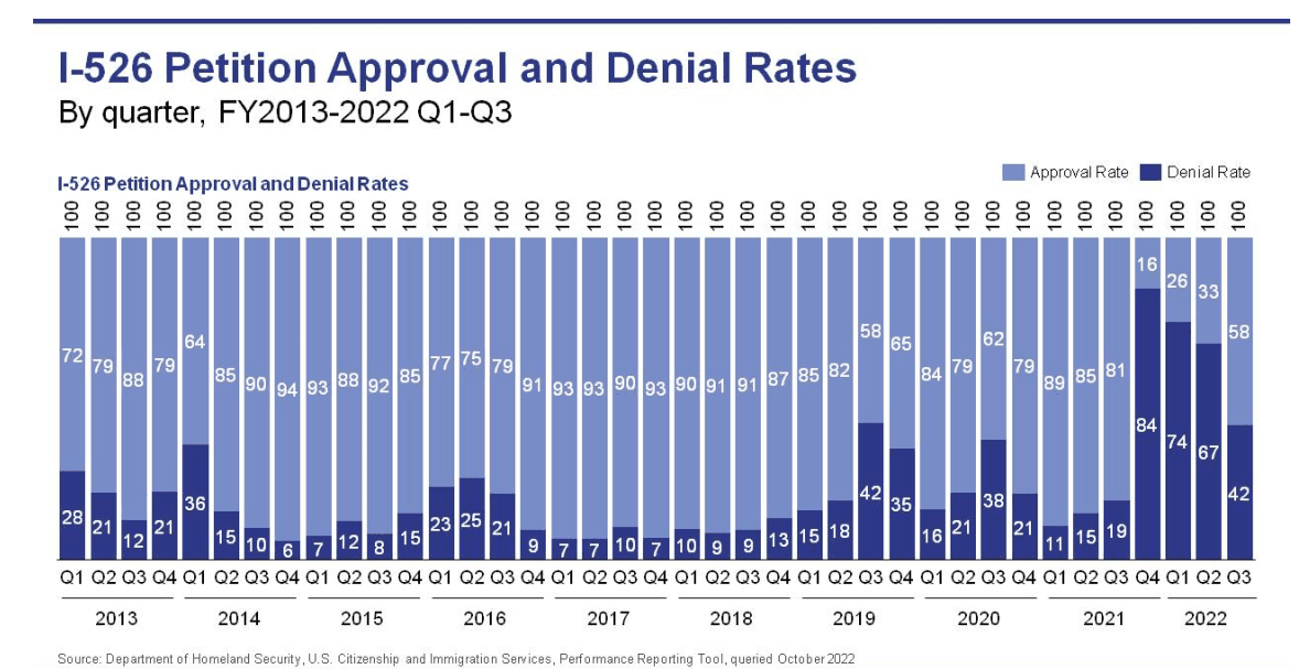Trong 3 quý đầu năm tài chính 2022, USCIS chỉ phê duyệt được 668 đơn I-526. So với cùng kỳ của năm tài chính 2021, con số này giảm đến 76%. Sự sụt giảm được lý giải do USCIS đã tạm dừng việc phê duyệt các đơn I-526 liên kết với Trung Tâm Vùng trong thời gian chương trình Đầu tư EB-5 thông qua Trung Tâm Vùng ngừng hoạt động.