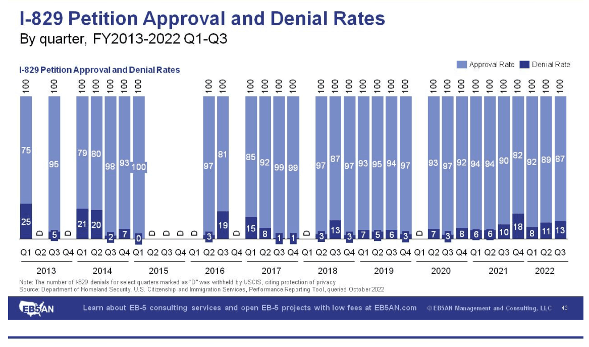 Từ quý I đến quý III năm tài chính 2022, USCIS đã xử lý tổng cộng 1.162 đơn I-829. Trong đó, có 389 đơn I-829 được xử lý trong quý III, với 340 đơn được chấp thuận và 49 đơn bị từ chối.