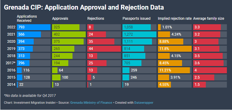 Vào cuối quý 3 năm nay, chương trình CIP đã nhận được tổng cộng 798 đơn đăng ký – mức đơn cao nhất lịch sử và vượt 40% so với tổng đơn năm ngoái. Tuy nhiên, trong 9 tháng đầu năm, đơn vị đầu tư cấp quốc tịch Grenada (CIU) chỉ xử lý được 333 đơn đăng ký. Trong đó, chấp thuận 325 đơn và từ chối 8 đơn.