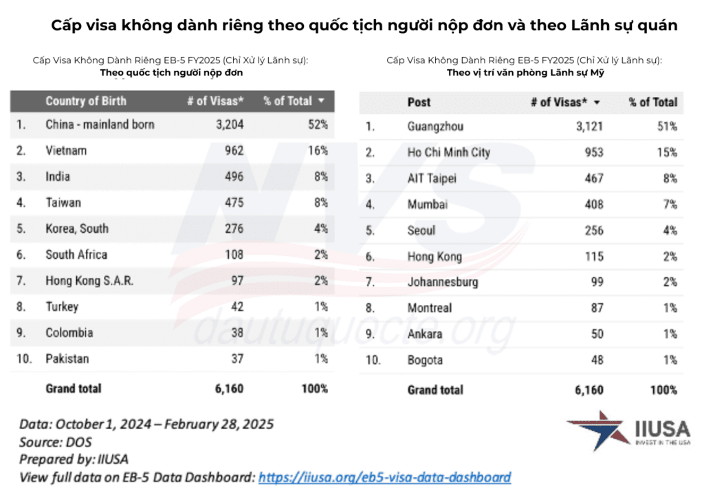 Bộ Ngoại giao Mỹ vừa công bố dữ liệu cấp visa EB-5 cho tháng 2 năm tài chính 2025 (FY2025), cho thấy số lượng visa EB-5 dành riêng được cấp đã tăng mạnh 111% so với tháng trước, với Việt Nam là quốc gia có số lượng visa được cấp nhiều nhất trên thế giới. Tuy nhiên, tổng số visa EB-5 được cấp trong tháng vẫn còn ở mức tương đối thấp.